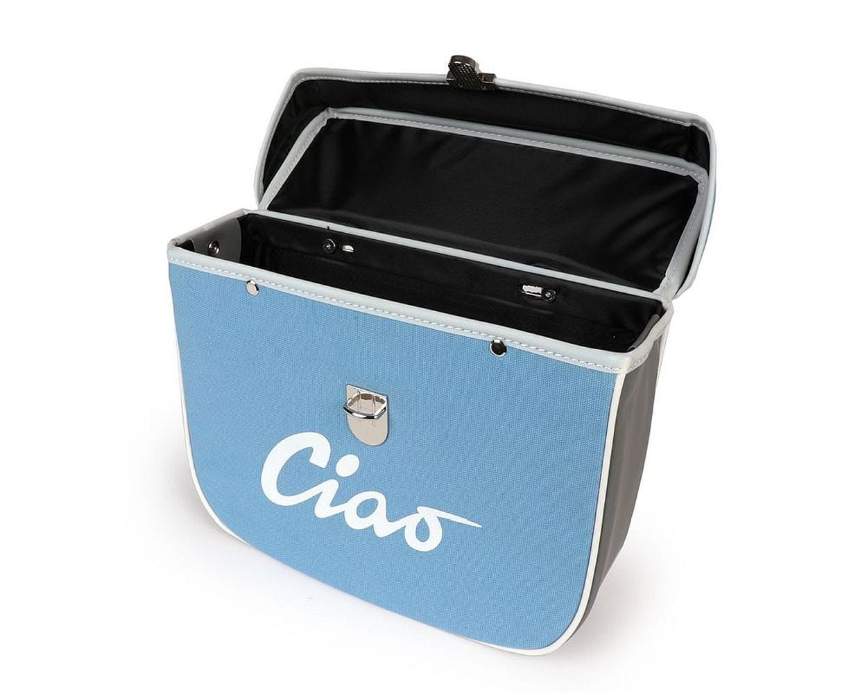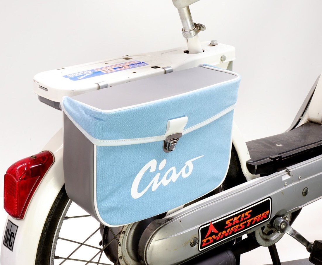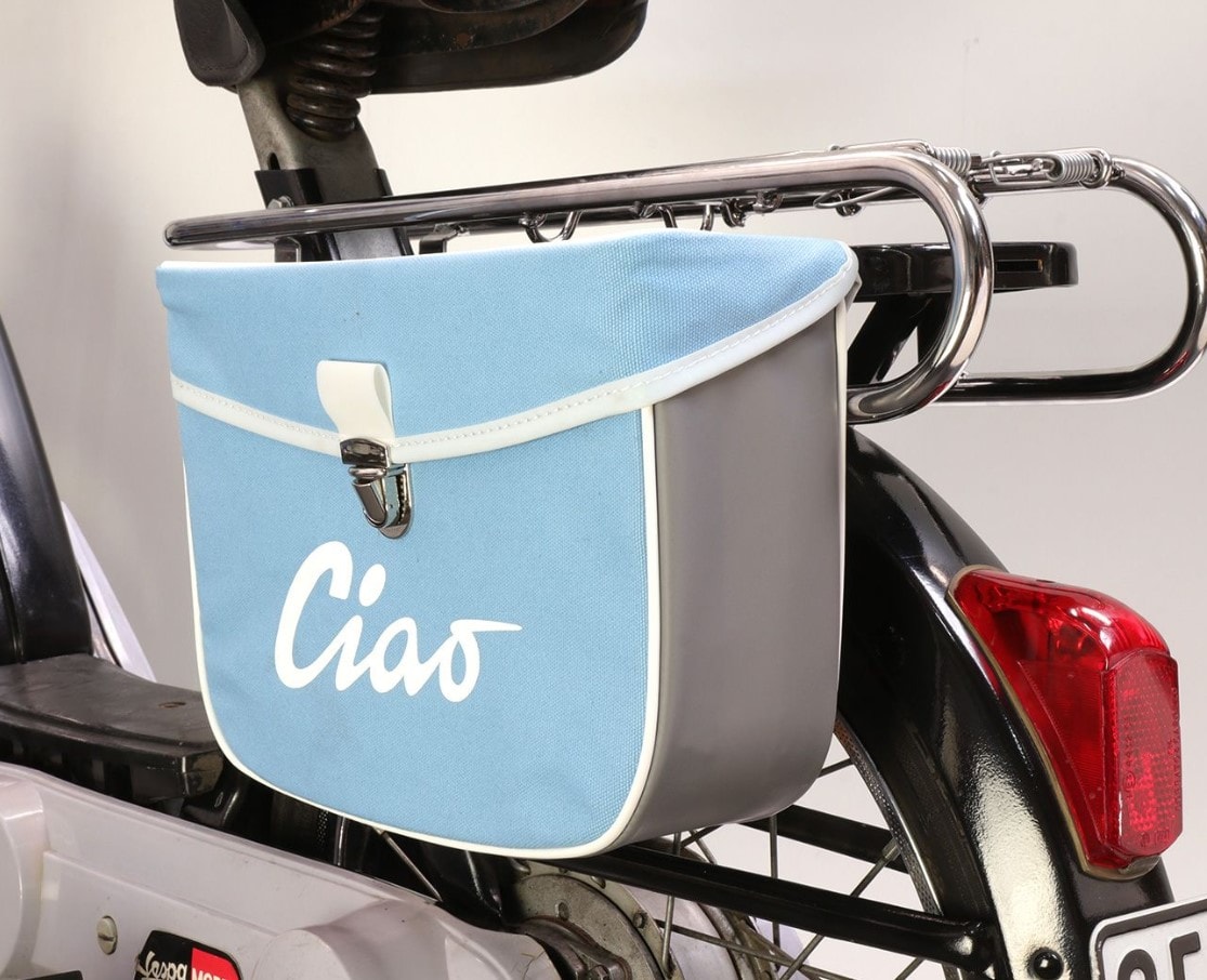 Snygg och högkvalitativ sidoväska i retrostil från Moto Nostra med Ciao-text samt justerbara krokar som gör den monterbar på alla modeller -1995.